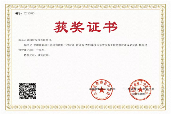 近日,山東省勘察設(shè)計(jì)協(xié)會(huì)、山東省建設(shè)工會(huì)公布的《2021年度山東省優(yōu)秀工程勘察設(shè)計(jì)成果競(jìng)賽結(jié)果的通知》中,正晨股份設(shè)計(jì)的中垠雅苑弱電智能化項(xiàng)目獲評(píng)優(yōu)秀建筑智能化項(xiàng)目三等獎(jiǎng),有力的助推了城市勘察設(shè)計(jì)水平的提升及城市建筑品質(zhì)的優(yōu)化。