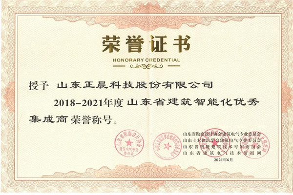 2021年6月20日~6月23日,山東省建筑電氣與智能化2021年年會(huì)在日照天德國(guó)際大酒店隆重舉行。正晨股份憑借過(guò)硬的工程質(zhì)量、豐富的項(xiàng)目實(shí)施經(jīng)驗(yàn),榮獲“2018-2021年度山東省建筑智能化優(yōu)秀集成商”榮譽(yù)稱(chēng)號(hào)。