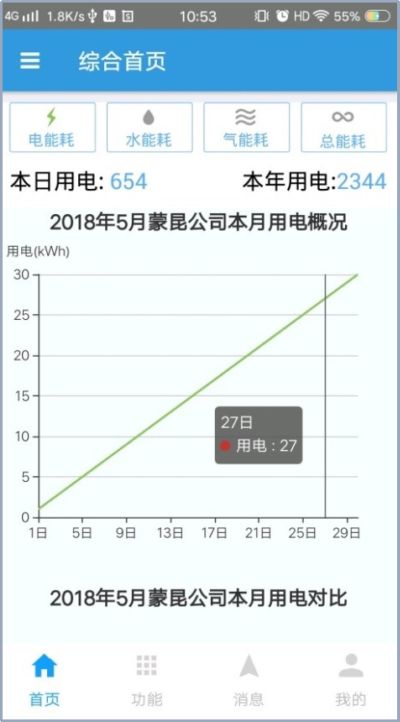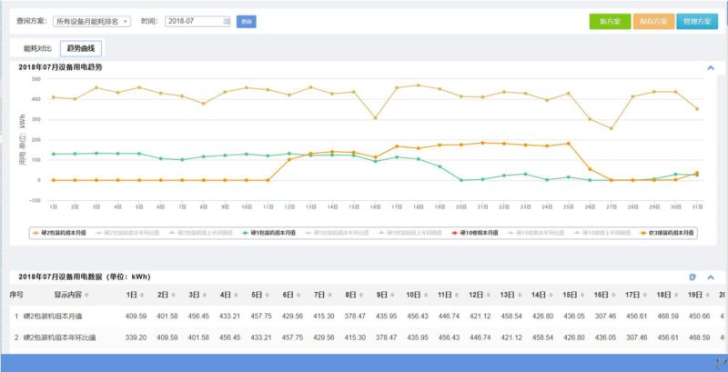 從界面中我們可以看到,此界面以折線圖和數(shù)據(jù)列表的形式向用戶展示所選設備的某一能耗分類本期值和同期值的對比分析。