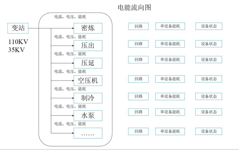 系統(tǒng)以工序樹形結(jié)構(gòu)的形式展示全公司電能流向圖,包括變電站的功率,各種工序的功率、能耗、電能參數(shù),設備的工作狀態(tài),是否過壓過在等信息。
