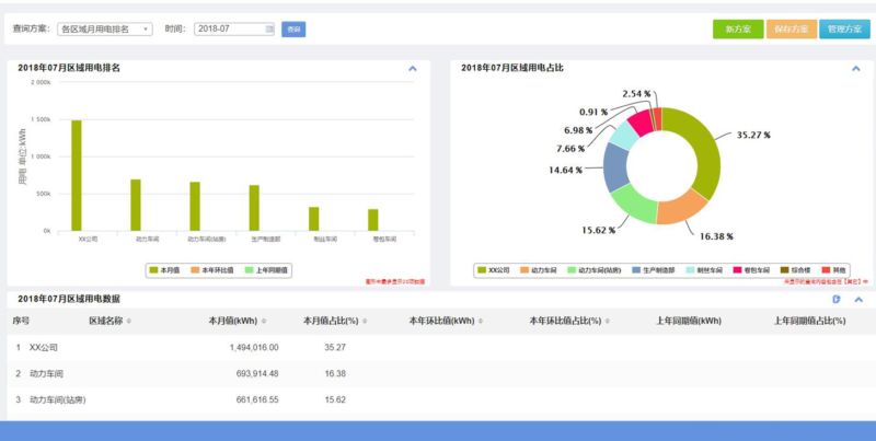 功能介紹:主要展示廠區(qū)內(nèi)所有區(qū)域的能耗量以及能耗排名、能耗占比,使管理人員了解全廠的重點用能區(qū)域。