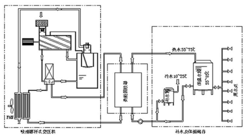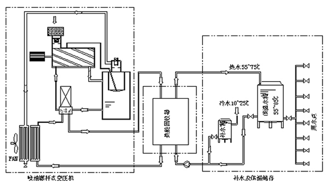 原理:回收空壓機冷卻水,集中到蓄水池。通過板換回收余熱。