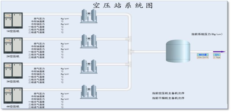 ? 空壓機群管理:實時檢測空壓機排氣壓力溫度、運行狀況,依據(jù)用氣情況合理控制空壓機運行數(shù)量,平衡空壓機運行時間。對空壓機運行異常進行報警,并對空壓機運行情況進行記錄、存儲。