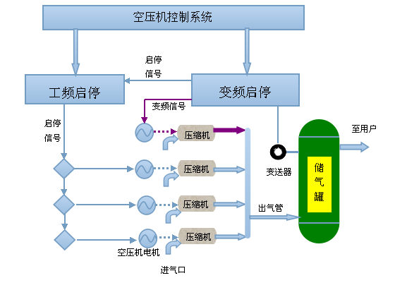 ? 單臺變頻空壓機輔控:通過變頻系統(tǒng)調(diào)節(jié)單臺空壓機運行,穩(wěn)定壓縮空氣系統(tǒng)整體壓力。