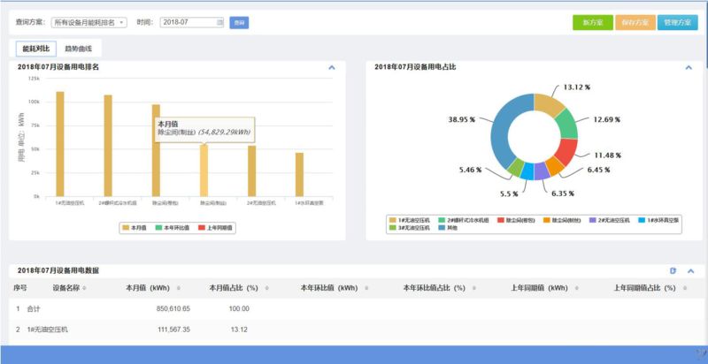 從界面中我們可以看到,所選設備的某一能耗分類本期值和同期值進行比對分析,包含內(nèi)容:各設備能耗排名柱圖、各設備能耗占比餅圖、各設備能耗數(shù)據(jù)列表。